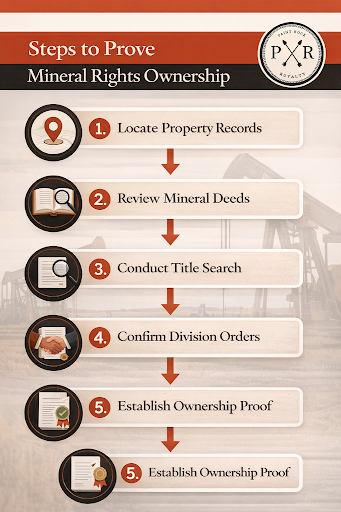 You can start by collecting your mineral deeds and reviewing the county clerk’s property records to confirm ownership history accurately.