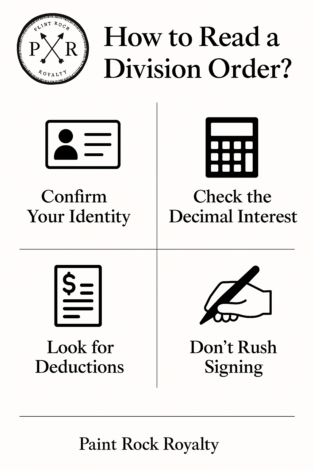 To read a division order means to analyze every part of that document, the property description, decimal interest, deductions, and effective dates, to ensure it matches your lease and ownership records.